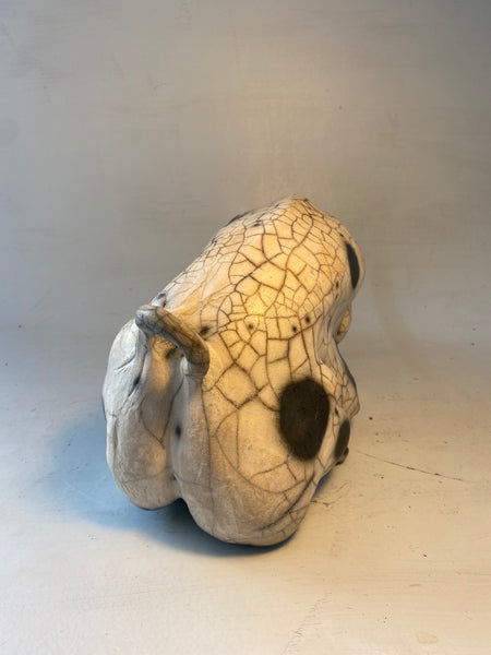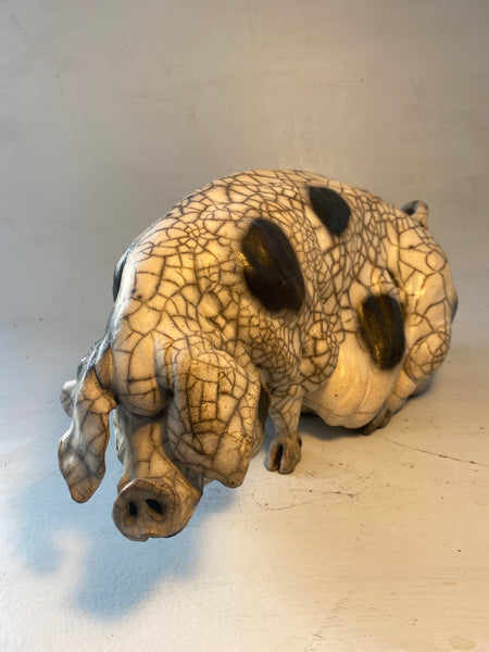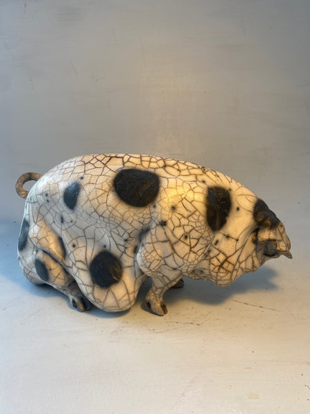 39 cm x 21 cm large sitting sow . Raku fired Gloucester old spot with polished finish