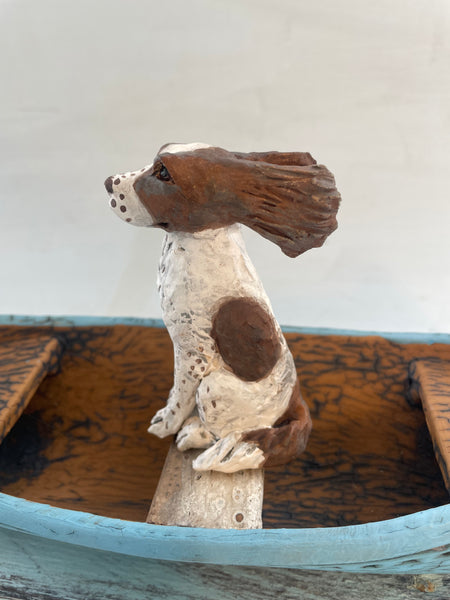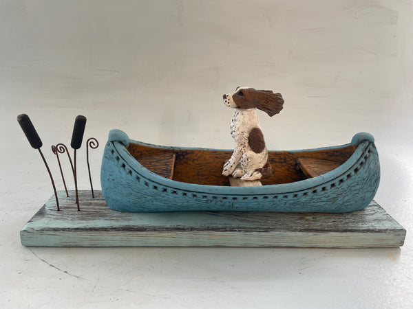 Collaboration piece . Canoe made by Mark Smith ans the spaniel made by Christine Cummings studio . Dimensions 38cmx9cmx 16cm