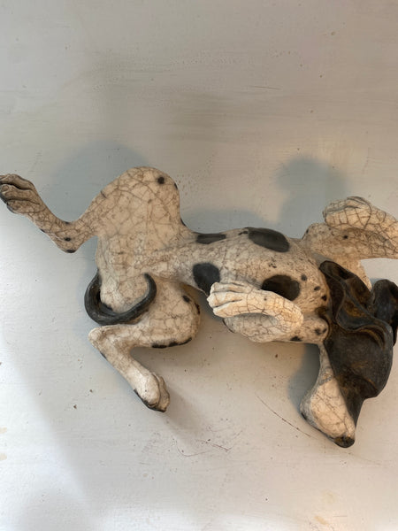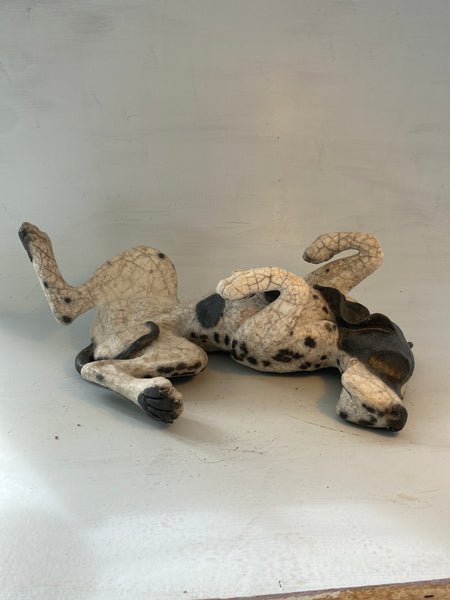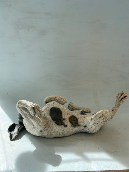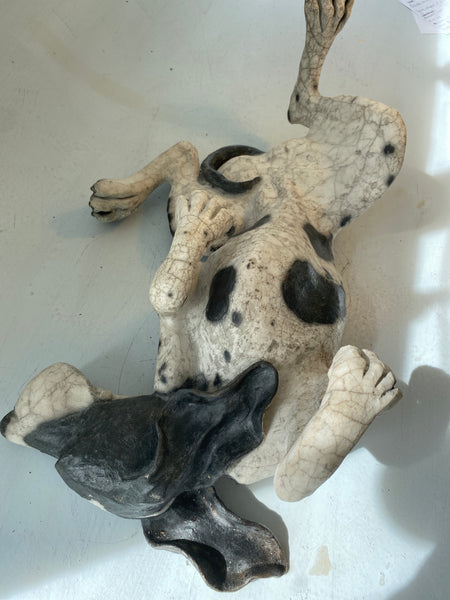 HALF PRICE. This raku firing is imperfect giving spotting where we didn’t want it but there are no other faults The crackle is very nice. 53 cm. long x 19 cm